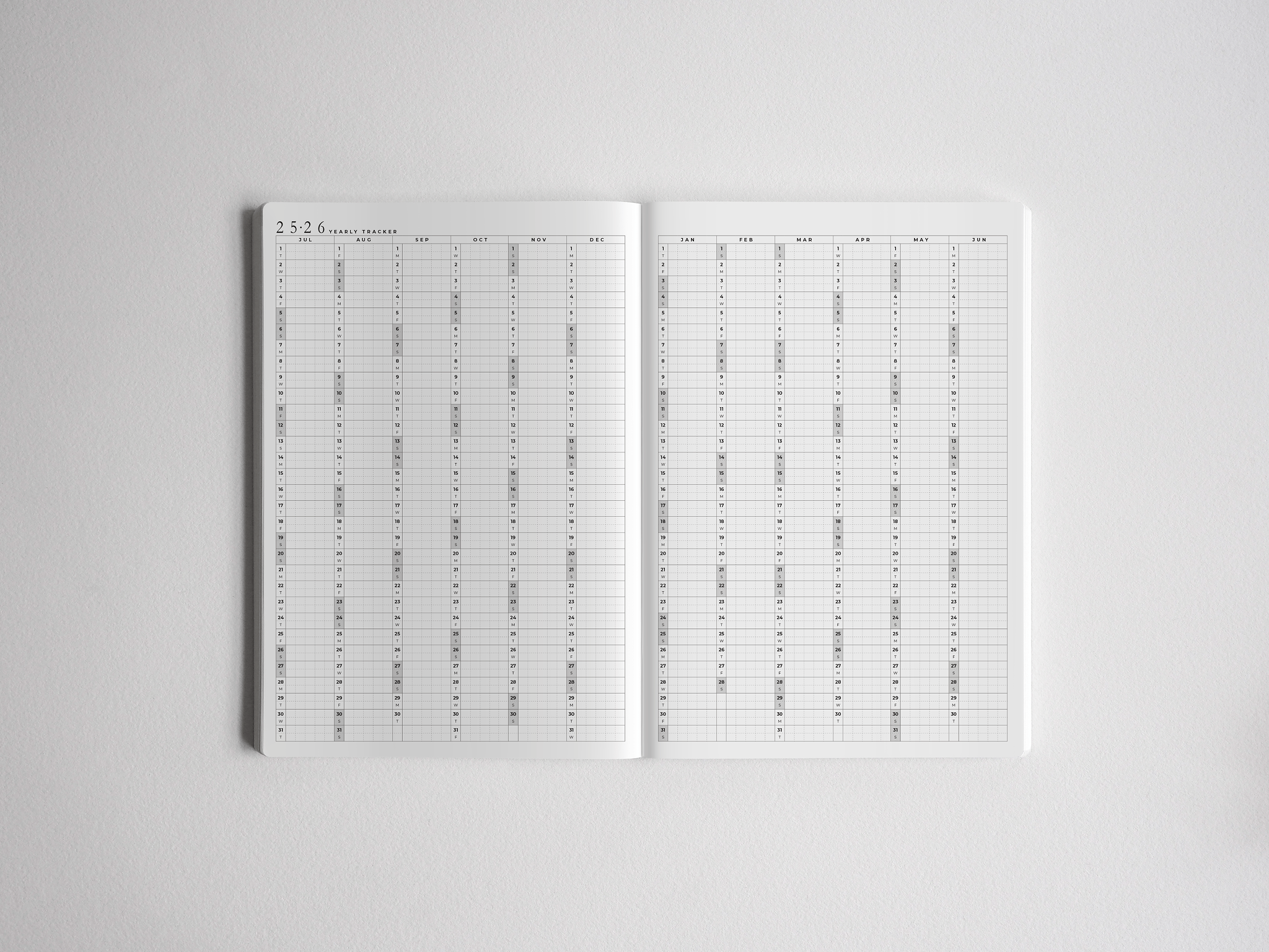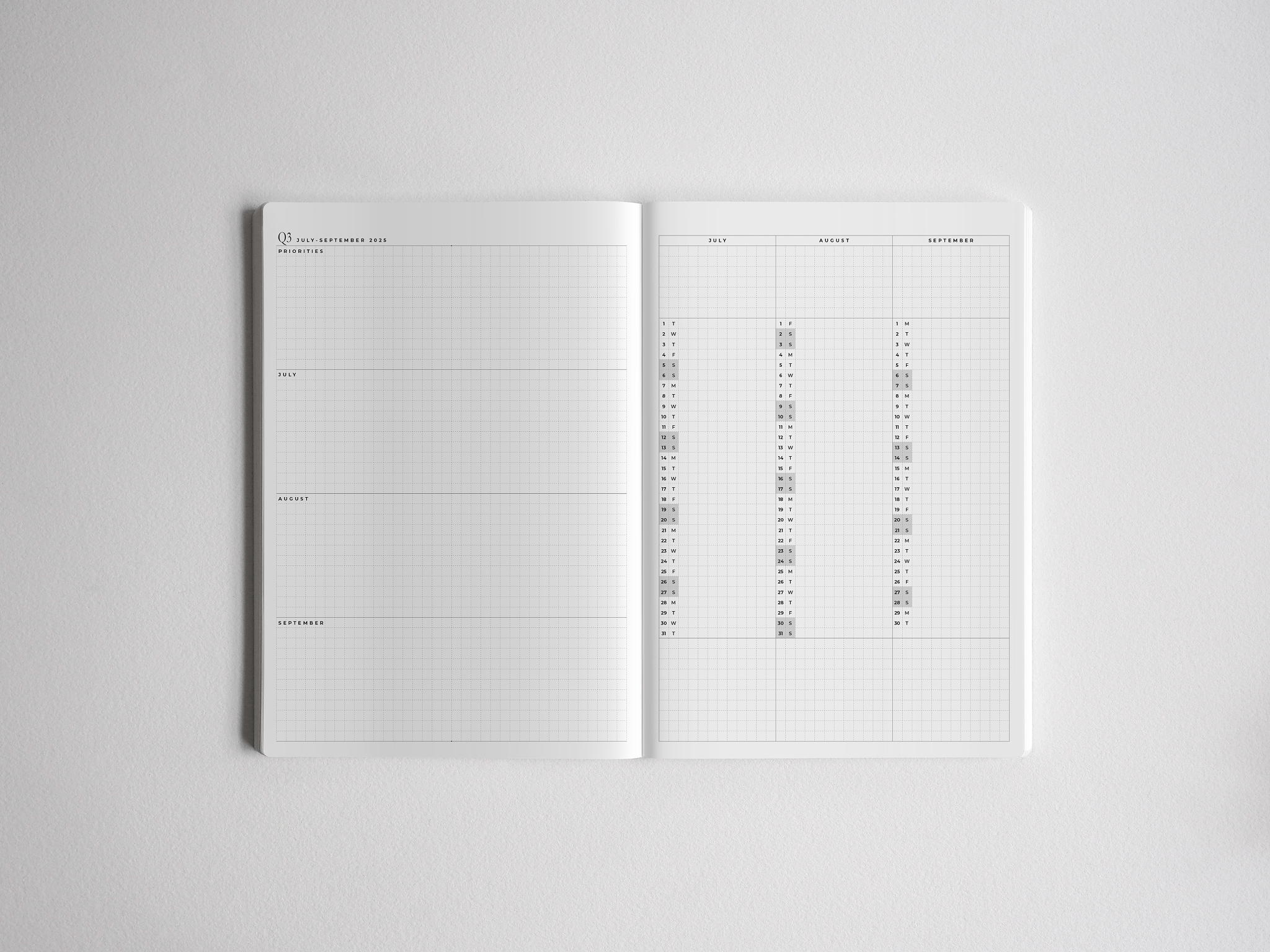 Our versatile layout adapts to your unique planning style, featuring a minimalist design on premium 52gsm Tomoe River paper. From vision boards to daily journaling pages, you can fully customize your experience.