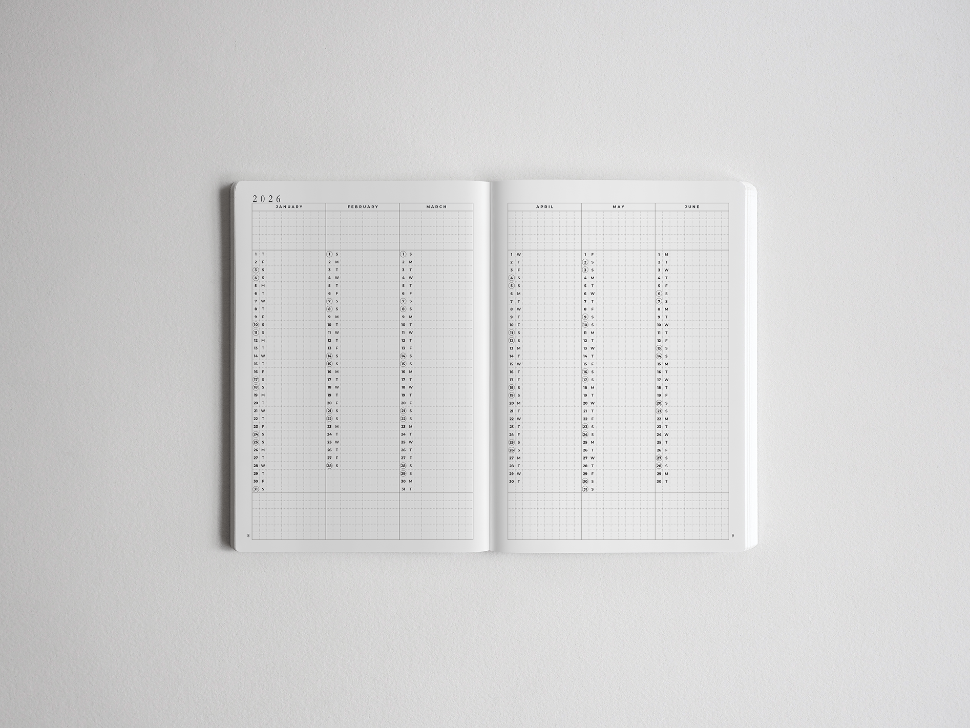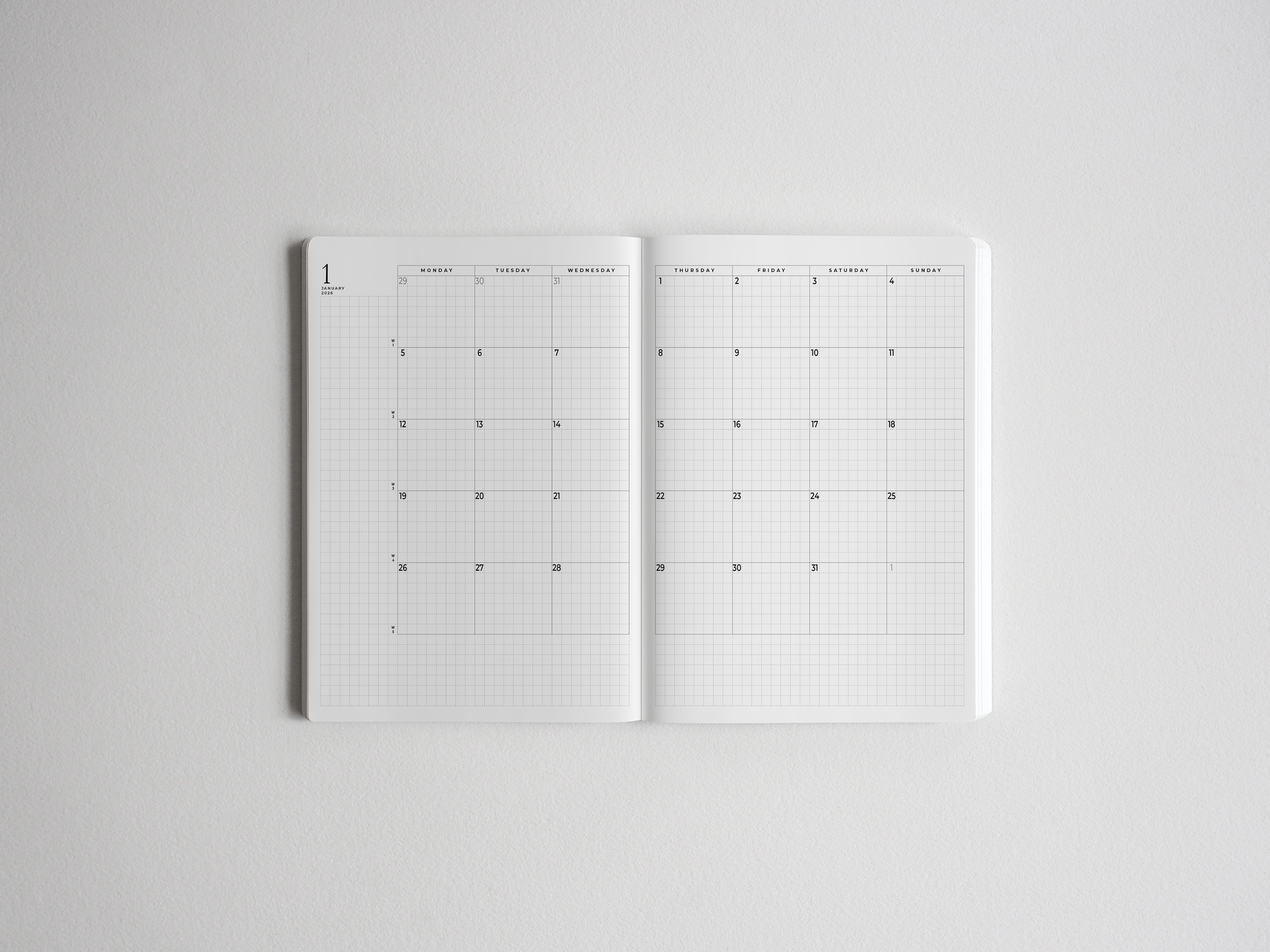 One monthly overview (blank) page at the beginning.