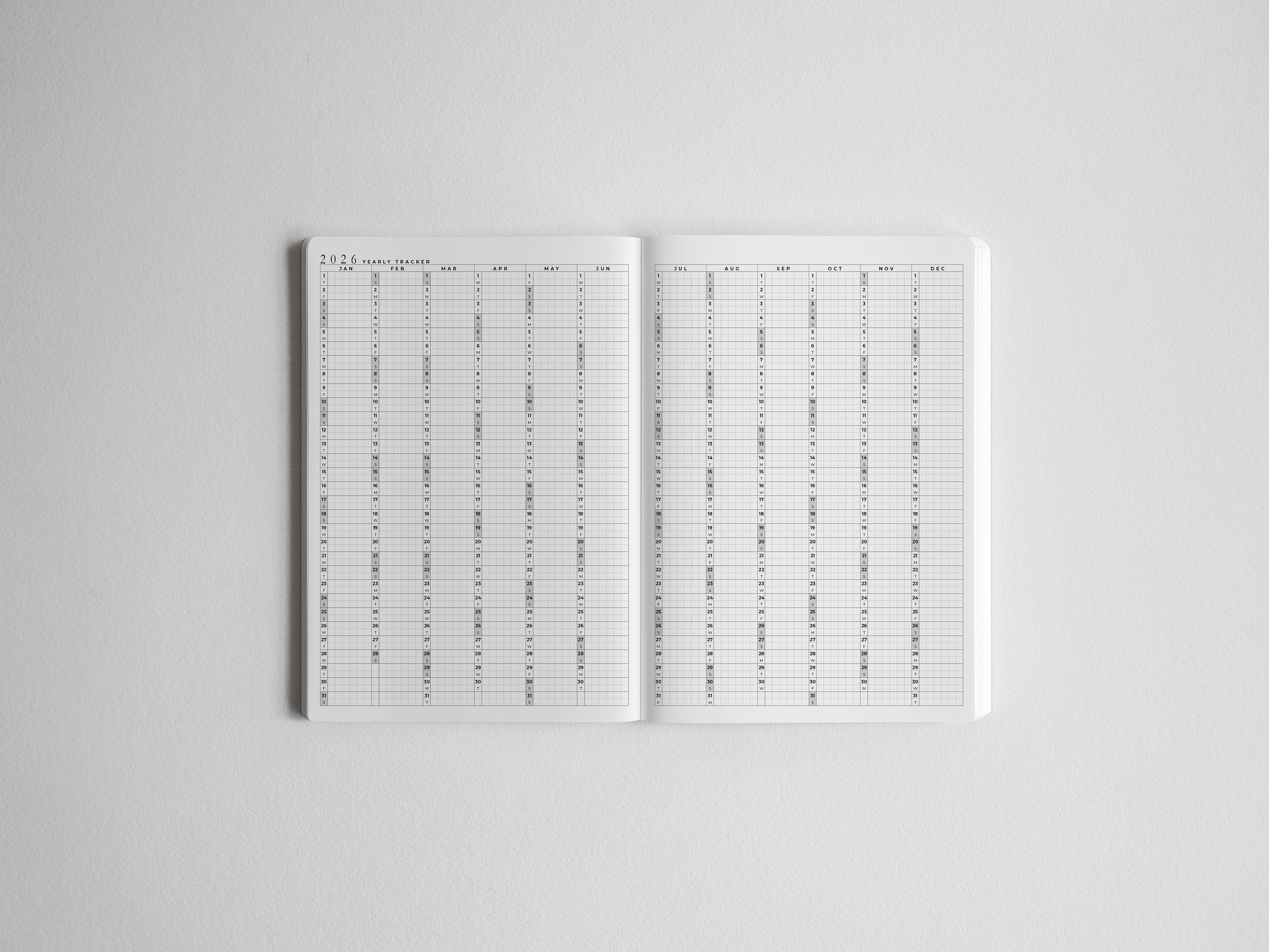 Yearly tracker (with weekends highlighted) on 2 pages